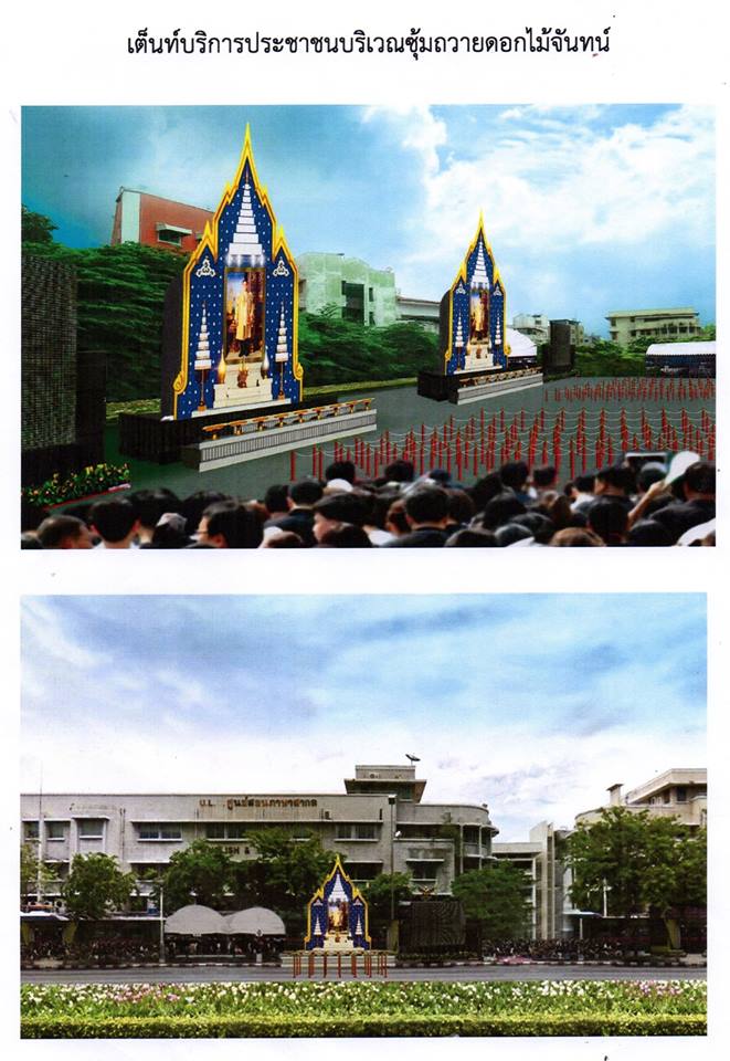 กทม.แจ้งให้ทราบว่าเต็นท์อาหารทุกเต็นท์จำเป็นจะต้องย้ายออกจากที่ตั้งเดิม และให้แต่ละเต็นท์เลือกเอาว่าจะไปอยู่ในจุดใด ซึ่ง กทม.จัดเตรียมเอาไว้ ๘ จุดใหญ่ อันเป็นที่ตั้งซุ้มวางดอกไม้จันทน์ โดยมีสำนักพระราชวังเป็นผู้ออกแบบ