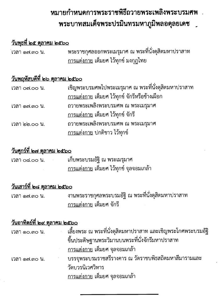ซึ่งงานพระราชพิธีถวายพระเพลิงจะเริ่มต้นในวันที่ ๒๕ ต.ค. ๖๐ สำนักพระราชวังจึงจำเป็นต้องงดการเปิดให้ประชาชนเข้ากราบพระบรมศพ