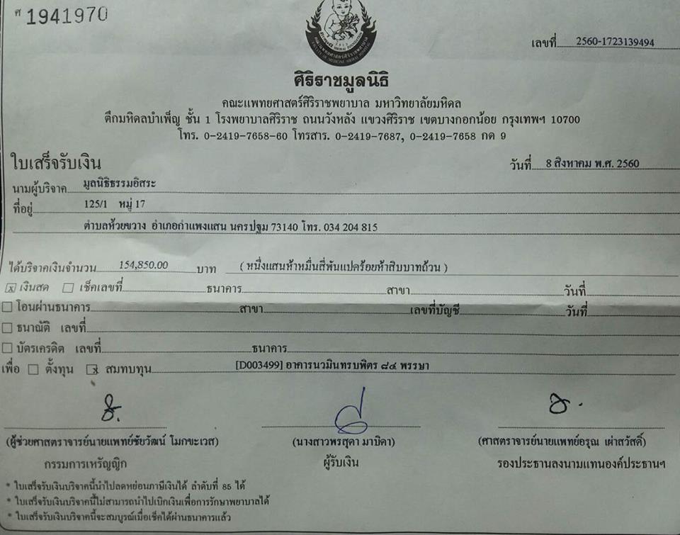 เงินที่พวกท่านถวายในงานนี้ได้จำนวน ๑๕๔,๘๕๐ บาท ฉันได้สั่งให้มูลนิธิธรรมอิสระนำไปบริจาคให้มูลนิธิศิริราชพยาบาล เพื่อสมทบทุนสร้างอาคารนวมินทรบพิตร84พรรษา และจัดซื้อเครื่องมือแพทย์สืบไป