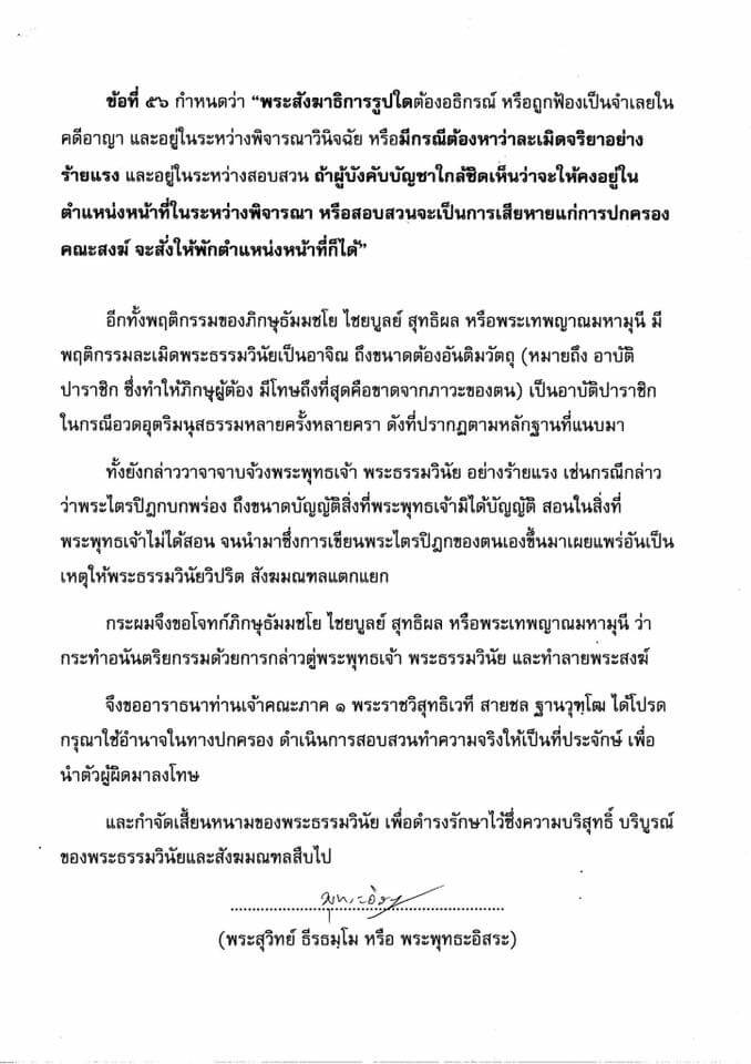 กระผมจึงขอโจทก์ภิกษุธัมมชโย ไชยบูลย์ สุทธิผล หรือพระเทพญาณมหามุนี ว่ากระทำอนันตริยกรรมด้วยการกล่าวตู่พระพุทธเจ้า พระธรรมวินัย และทำลายพระสงฆ์