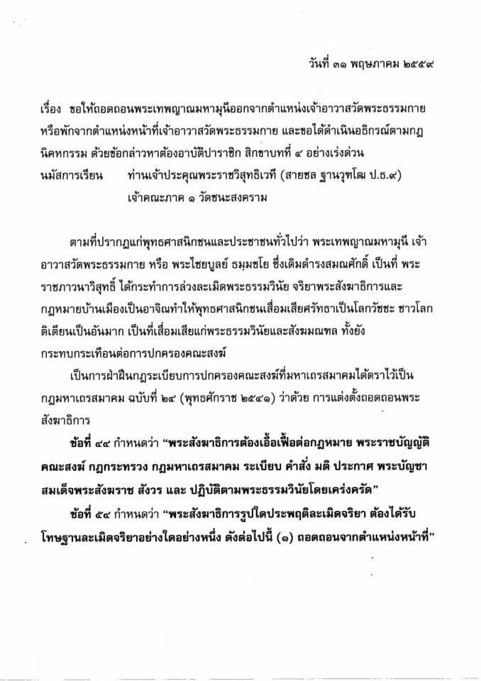 ตามที่ปรากฎแก่พุทธศาสนิกชนและประชาชนทั่วไปว่า พระเทพญาณมหามุนี เจ้าอาวาสวัดพระธรรมกาย หรือ พระไชยบูลย์ ธมฺมชโย ซึ่งเดิมดำรงสมณศักดิ์ เป็นที่ พระราชภาวนาวิสุทธิ์ ได้กระทำการล่วงละเมิดพระธรรมวินัย จริยาพระสังฆาธิการและกฎหมายบ้านเมืองเป็นอาจิณทำให้พุทธศาสนิกชนเสื่อมเสียศรัทธาเป็นโลกวัชชะ ชาวโลกติเตียนเป็นอันมาก เป็นที่เสื่อมเสียแก่พระธรรมวินัยและสังฆมณฑล ทั้งยังกระทบกระเทือนต่อการปกครองคณะสงฆ์